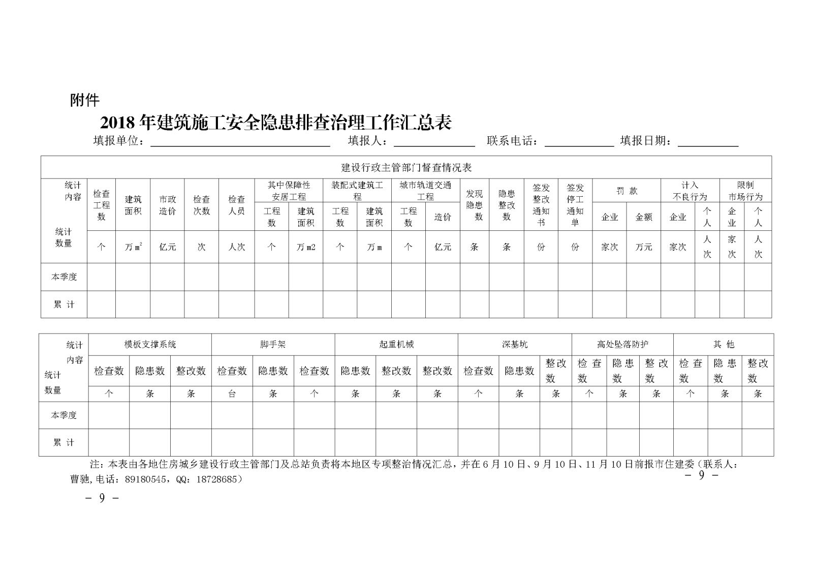 各地住房城鄉建設行政主管部門及總站要做好相關信息匯總和報送工作。在6月10日、9月10日、11月10日前,將本地區開展專項整治工作匯總表及年度總結報我委質安處,聯系人:曹馳,聯系電話:89180545,QQ:18728685。同時,在每季度末月25日前,及時將隱患排查治理信息錄入到“寧波市安全生產隱患排查治理信息平臺”。